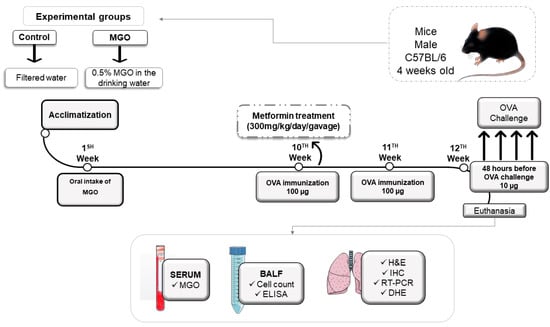 Experimental protocol of immunization and challenge with ovalbumin (OVA). Male C57BL/6 mice were treated or not with oral 0.5% methylglyoxal (MGO) for 12 weeks and then treated with metformin for the last 2 weeks. Some parts of the figure were drawn by using pictures from Servier Medical Art. Servier Medical Art by Servier is licensed Under a creative common attribution 3.0 Unported License (https://creativecommons.org/licenses/by/3.0/ accessed on 15–16 February 2023). BALF, bronchoalveolar lavage fluid; H&C, hematoxylin/eosin; IHC, immunohistochemistry; DHE, dihydroethidium.