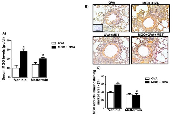 Levels of methylglyoxal (MGO) in serum (A) and immunohistochemical (IHC) staining for MGO in the airways of ovalbumin (OVA)-challenged mice (B,C). Mice were treated or not with 0.5% MGO for 12 weeks in the drinking water and metformin (MET; 300 mg/kg/day, gavage for 2 weeks), after which they were all intranasally challenged with OVA. Serum levels of MGO were measured by ELISA kit (A). Panel (B) shows the representative images of immunostaining expression for MGO in the peribronchiolar regions (staining in brown; bar = 100 μm and 200× objective). Panel C shows the MGO immunostaining quantification (marked area). Data in panels A and C are expressed as mean ± SEM for (n = 7–8). * p < 0.05 compared with respective vehicle group. # p < 0.05 compared with MGO + OVA in vehicle group.