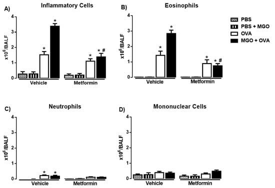 Number of total (A) and differential number of inflammatory cells (eosinophils, neutrophils, and mononuclear cells; (B–D)) in bronchoalveolar lavage fluid (A–D) in mice instilled with phosphate-buffered saline (PBS) or intranasally challenged with ovalbumin (OVA). Mice were treated or not with 0.5% methylglyoxal (MGO) for 12 weeks in the drinking water alone or combined with metformin (MET). Data are expressed as mean ± SEM for (n = 7–8). * p < 0.05 compared with the CT groups. # p < 0.05 compared with the MGO + OVA in vehicle groups.