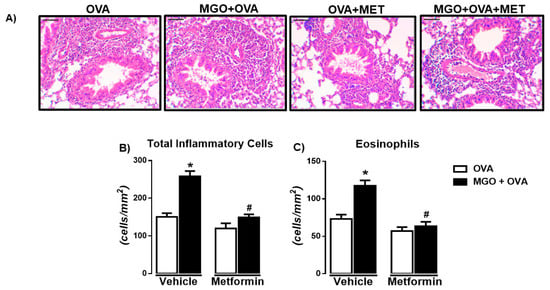 Representative images of hematoxylin and eosin (H&E) staining (A) and number of total inflammatory cells (B) and eosinophils (C) in lung tissue sections of ovalbumin (OVA)-challenged mice (bar = 200 μm; 200× objective). Mice were treated or not with 0.5% methylglyoxal (MGO) for 12 weeks in the drinking water alone or combined with metformin (MET). Data are expressed as mean ± SEM for (n = 7–8). * p < 0.05 compared with respective vehicle groups. # p < 0.05 compared with the MGO + OVA in vehicle groups.