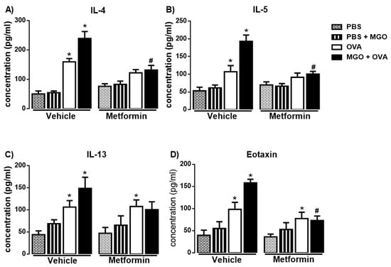 Levels of the Th2-cytokines IL-4, IL-5, IL-13 and eotaxin (A–D) in bronchoalveolar lavage fluid of mice instilled with phosphate-buffered saline (PBS) or intranasally challenged with ovalbumin (OVA). Mice were treated or not with 0.5% methylglyoxal (MGO) for 12 weeks in the drinking water alone or combined with metformin (MET; 300 mg/kg/day, gavage, 2 weeks). Data are expressed as mean ± SEM for (n = 7–8). * p < 0.05 compared with respective vehicle groups. # p < 0.05 compared with the MGO + OVA in vehicle groups.