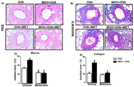 Representative images and quantification (%) of mucus production (A,C) and collagen deposition (B,D) in lung sections of ovalbumin (OVA)-challenged mice, according to periodic Acid-Schiff (PAS) and Masson’s trichrome, respectively (bar = 200 μm; 200× objective). Mice were treated or not with 0.5% methylglyoxal (MGO) for 12 weeks in the drinking water alone or combined with metformin (MET). Data are expressed as mean ± SEM for (n = 7–8). * p < 0.05 compared with respective vehicle groups. # p < 0.05 compared with the MGO + OVA in vehicle groups.