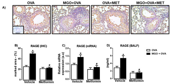Expressions of the receptor for advanced glycation end products (RAGE) in the lung sections and bronchoalveolar lavage fluid (BALF) of ovalbumin (OVA)-challenged mice. Mice were treated or not with 0.5% methylglyoxal (MGO) for 12 weeks in the drinking water alone or combined with metformin (MET). Panels (A,B) show, respectively, representative images and percent quantification (% marked area) of RAGE by immunohistochemistry (IHC; brown staining) of the peribronchiolar regions (bar = 200 μm, 200× objective). Panel (C) shows the RAGE expression by RT-PCR in the lung homogenates, and panel (D) shows the levels in BALF. Data are expressed as mean ± SEM for (n = 7–8). * p < 0.05 compared with respective vehicle groups. # p< 0.05 compared with the MGO + OVA in vehicle groups.