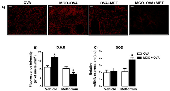 Representative images of the levels of reactive-oxygen species (ROS) (A) and quantification of dihydroethidium (DHE; bar = 200 μm, 200× objective) in lung tissues of ovalbumin (OVA)-challenged mice. Mice were treated or not with 0.5% methylglyoxal (MGO) for 12 weeks in the drinking water alone or combined with metformin (MET). Panel (B) Levels of ROS through dihydroethidium (DHE)-induced fluorescence in lung tissue and (C) shows the superoxide dismutase (SOD) expression by RT-PCR in the lungs. Data are expressed as mean ± SEM for (n = 7–8). * p < 0.05 compared with respective vehicle groups. # p < 0.05 compared with the MGO + OVA in vehicle groups.