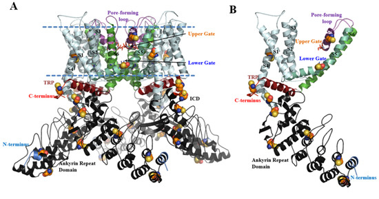 The structural overview of TRPV1 (PDB: 3J5Q [17]). The key structural features were labeled and colored differently. The region between the two dashed lines is transmembrane. (A) The whole structure of TRPV1 tetramer; (B) The monomer of TRPV1.