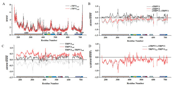 The RMSF and profiles for representative MD trajectories. The residue positions corresponding to the ARD, preS1, S1, S2, S3, S4, S5, S6, and TRP helix are labeled and colored in the same color. (A) The RMSF values of each residue in cTRPV1-oxi (black line) and cTRPV1-red (red line) systems; (B) The profiles for cTRPV1 (black line) and oTRPV1 (red line). The gray line stands for the difference between red line and black line; (C)The profiles between the open and closed TRPV1 systems with C387-C391 forming a disulfide bond (TRPV1oxi, black line), or with the reduced cysteine pair (TRPV1red, red line). The gray line stands for the difference between red line and black line; (D) The gray lines from figure (B) (black) and (C) (red) overlaid well.