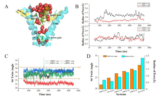 Characterization of the pore and S6 twist angle profiles. (A) The distribution of the water molecules in the pore of TRPV1; (B) The radius of TRPV1 pore profiles for representative MD trajectories, unit: Å; (C) The curve of S6 twist angles with simulation time; (D) The average S6 twist angle and the average radius of pore after simulation.