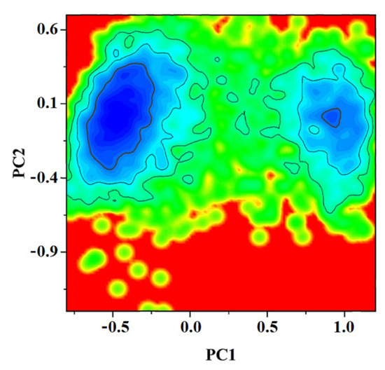 The principal component (PC) analysis of cTRPV1-oxi. From blue to red indicates the free energy from the lowest to the highest.