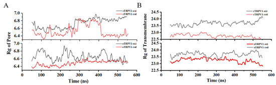 The Rg profiles, unit: Å. (A) the Rg of pore; (B) The Rg of transmembrane domain.