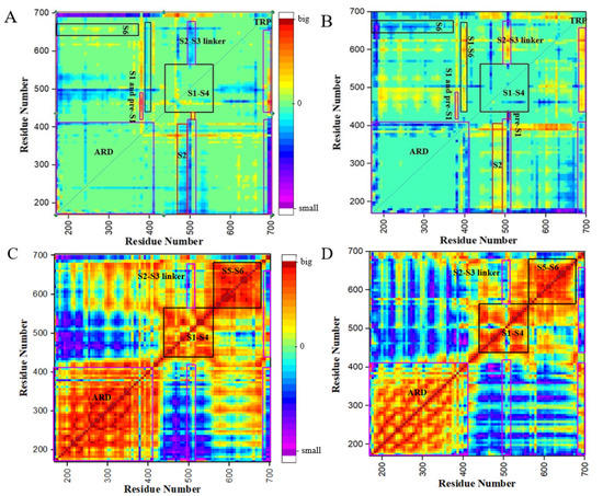 To further investigate the relationship between the motions, we performed a correlation coefficient analysis on the distance matrix. It is clear from Figure 6C,D that there are four regions: the ARD, S1–S4, S5–S6, and TRP helix, which are positively correlated for their intra-domain motions in different redox environments. It indicated that these domains are structurally stable within domains, and they each moved as a unit during conformation transfer. The motions of ARD and S1–S4 were always negatively correlated at different redox states. The motion of ARD was positively correlated with the motion of S5–S6 during partial activation of the channel and negatively correlated with the motion of S5–S6 during channel closure. The TRP motion showed a weak negative correlation with the motion of S5–S6 and ARD during pore opening and a weak positive correlation with pore closure. Thus, the motions of ARD, S1–S4, and S5–S6 are closely correlated.