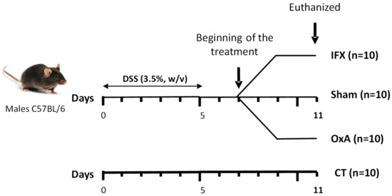 Figure 1 shows the experimental protocol used in this study. Mice received DSS in drinking water for 5 days. On day 5, the animals were then randomly distributed into the different experimental groups. With colitis being maximal on day 7, the treatment was initiated at day 7. Mice treated with IFX received only one injection at day 7, while those receiving OxA were injected every morning for 4 days. Mice were euthanized at day 11.