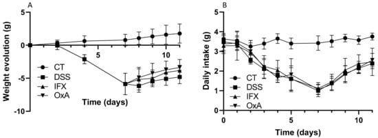 Weight gain evolution (A) and daily intake (B) as a function of time values are means ± SEM (n = 10). CT: control; DSS: dextran sodium sulfate; IFX: infliximab; OxA: orexin-A.
