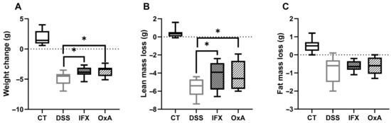 Weight evolution after 11 days (A), lean mass loss (B) and fat mass loss (C); values are means ± SEMs (n = 10). A t-test was used to compared DSS-untreated animals to IFX- or OxA-treated animals (* p < 0.05). Lean and fat mass were evaluated using a Lunar PIXImus densitometer. CT: control; DSS: dextran sodium sulfate; IFX: infliximab; OxA: orexin-A.