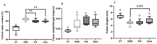 The administration of 3.5% DSS induced inflammation that was associated with an increased water content in the colonic fluid and thus with diarrhea. Four-day treatment with IFX or OxA decreased the water content in the colonic content when compared with that in untreated animals (Figure 4A). However, we did not observe any significant effect of the two treatments on the colon weight (Figure 4B) or length (Figure 4C), but OxA tended to increase the colon length (p < 0.057).