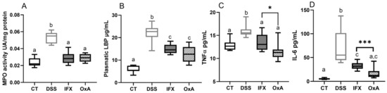 Effect of DSS, IFX and OxA at day 11 on the plasma inflammation markers MPO activity (A), LBP (B), TNFα (C), and IL-6 (D) plasma levels. Values are means ± SEMs (n = 10). Values were compared using a one-way analysis of variance (ANOVA) and a Tukey multiple comparison test. Values with different letters are significantly different (p < 0.05). A t-test was also used to assess the difference between the two treatments (* p < 0.05, *** p < 0.001). CT: control; DSS: dextran sodium sulfate; IFX: infliximab; OxA: orexin-A; MPO: myeloperoxidase; LBP: lipopolysaccharide-binding protein; TNFα: tumor necrosis factor alpha; IL-6: interleukin-6.