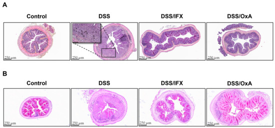 2.3. Histological Changes Induced by DSS and Effects of IFX and OxA Treatments
