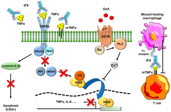 Oxa and IFX main signaling pathways involved in anti-inflammatory effects. The orexin/receptor system may trigger the anti-inflammatory functions though the inhibition of NF-κB. An anti-apoptotic signal is regulated by mTNFα, and this mechanism is inhibited by anti-TNFs inducing, consequently, the apoptosis of CD4+ cells. Anti-TNFs also bind to mTNFα on activated T cells, and consequently, the Fc part of the antibody is recognized by the Fc receptors, thus triggering the wound-healing macrophages. TNFα: tumor necrosis factor alpha; IL-6: interleukin-6; IFX: infliximab; TNFRs: tumor necrosis factor alpha receptors; mTNFα: membrane-bound from of tumor necrosis factor alpha; TRADD: tumor necrosis factor alpha receptor type 1 associated death domain protein; TRAF: tumor necrosis factor alpha receptor-interacting protein 1; NF-κB: nuclear factor Kappa B; NIK: nuclear factor Kappa B-inducing protein; MEKK: mitogen-activated protein/ERK kinase; IKB: inhibitor of nuclear factor kappa B; OX1R; orexin receptor 1; Gq: G protein; PLC: phospholipase C.
