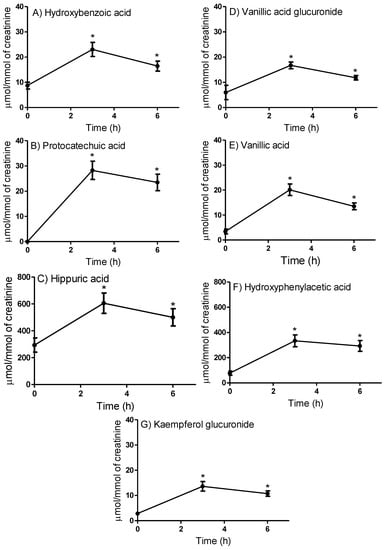 Concentration of phenolic compounds quantified in the urine of ten subjects after consumption of the juçara juice: hydroxybenzoic acid (A), protocatechuic acid (B), hippuric acid (C), vanillic acid glucuronide (D), vanillic acid (E), hydroxyphenylacetic acid (F), and kaempferol glucuronide (G). No significant differences were detected between the tests carried out 0–3 h and 3–6 h after the intake. Data expressed as the means and standard error of the mean (SEM). Note: * p-values < 0.05 compared to the baseline (n = 8–10); one-way ANOVA and Tukey’s post hoc test.