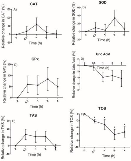 Relative changes in the serum and erythrocyte antioxidant parameters catalase (CAT) (A), superoxide dismutase (SOD) (B), glutathione peroxidase (GPx) (C), uric acid (D), total antioxidant status (TAS) (E), total oxidant status (TOS) (F) after the juçara juice consumption. Data are expressed as the means and SEM. Note: * p-values < 0.05 compared to the baseline (n = 8–10); one-way ANOVA and Tukey’s test.