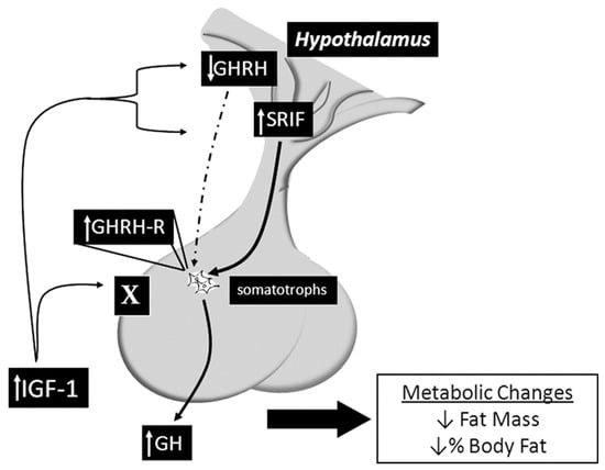 The mechanism of GH production is a complex process that is regulated by a variety of hormones and neurotransmitters. In normal individuals, GH is produced and released by the pituitary gland in a pulsatile manner. The primary triggers for GH release are the hypothalamic hormones GHRH and ghrelin. Ghrelin, a hormone produced by the stomach, promotes hunger and increases GH release, while GHRH stimulates the pituitary gland to release GH [67,68,69]. In addition, other hormones such as IGF-1 and cortisol modulate GH secretion. The release of GH is also suppressed by the hypothalamic hormone SST, which acts as an inhibitor for the release of GH [70]. Obesity has been associated with alterations in the pattern of GH production; however, the underlying mechanisms are not fully understood. Studies have shown that individuals with obesity have lower GH levels and a less pulsatile pattern of secretion than those with normal body weight [65]. A previous study has found that obesity impairs sensitivity to the effects of arginine infusion on human GH levels, with peak levels being significantly lower in obese subjects compared with normal subjects. However, changes in insulin levels were similar between the two groups [71,72]. A recent study was designed to investigate the impact of body composition on GH production in non-obese adults. The results showed that abdominal fat was the major predictor of GH production, with higher levels being associated with lower GH production. This study also found that physical fitness was positively associated with GH production. This study concluded that abdominal fat plays a significant role in determining GH secretion in healthy non-obese adults; however, the exact mechanisms behind this relationship are not yet understood [73]. In an attempt to understand the underlying mechanisms regulating GH production in obesity, scientists have proposed several hypotheses. One possible explanation is that excess adipose tissue in obesity may lead to increased levels of circulating insulin and free fatty acids (FFAs), which can inhibit GH secretion by suppressing the principal regulator, the GHRH hormone. A previous study aimed to investigate the effect of FFA on GH secretion in response to GHRH in a sample of six young, healthy men. The study found that the peak GH response following GHRH administration was significantly reduced in the group that received the lipid-heparin infusion compared with the peak GH response in the control group. These results suggest that elevations in plasma FFA levels can inhibit GH secretion in response to GHRH. Due to the small sample size, further research is necessary to fully understand the underlying mechanisms and generalizability of the findings [74]. Furthermore, pharmacological interventions that reduce FFA levels have increased GH secretion. Conversely, elevations in FFA levels have been found to inhibit GH secretion, both at baseline and in response to various stimuli, such as reductions in FFA levels, hypoglycemia, physical exercise, or administration of GHRH or GHRP-6 (a synthetic hexapeptide that specifically triggers the release of GH by pituitary somatotrophs) [75]. Additionally, excess adipose tissue may also lead to increased levels of circulating insulin and FFAs, inhibiting GH secretion [76].