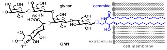 GM1 (or GM1a) is a glycosphingolipid (GSL) consisting of a pentasaccharide and a ceramide (Cer), which are coupled together by a β-glycosidic linkage (Figure 1). GM1 is one of the gangliosides, i.e., sialylated ganglio-series GSLs, since its glycan contains an N-acetylneuraminic acid (Neu5Ac) residue, which is the most common member of the family of sialic acids and thus is frequently referred to as the “sialic acid”. GM1 is usually anchored onto the cell surface through embedding its lipid chains into the plasma membrane bilayer, leaving the glycan as the outer leaflet (Figure 1). GM1 is one of the main GSLs in the plasma membrane of the vertebrate central nervous system (CNS) to play a key role in various functions of the CNS [1]. GM1 is also abundant in peripheral tissues closely associated with many other physiological and pathological processes [2,3,4,5]. However, this article is focused on the research progress related to the distribution and function of GM1 in the CNS, as well as its relationships with various CNS-related diseases.