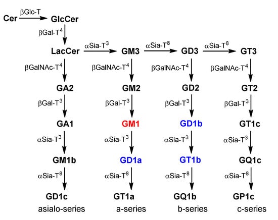 Biosynthesis of ganglio-series GSLs. The numbers in superscript indicate the glycosylation sites of GTs. GM1, GD1a, GD1b, and GT1b are the major gangliosides in the human brain.