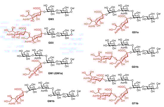 Specifically, dramatic changes in the expression levels and patterns of gangliosides have been associated with the development of rat and mouse brains. Simple gangliosides (GM3 and GD3, Figure 4) are rich in the early embryonic stages, but more complex gangliosides (GM1, GD1a, GD1b and GT1b, Figure 4) are predominant in the late developmental stages of the brain [38,39,40,41,42,43]. In rats, the decrease in GM3 and GD3 and the increase in GM1, GD1a and GT1a are correlated with the increase of GalNAc-T that transforms GM3 into GM2, and at birth, GM3 and GD3 are already minor components in the rat brain. During brain maturation, the total ganglioside content can increase several fold [30]. However, the total ganglioside content of the mouse brain was almost constant from young adulthood to the beginning of senescence, despite the changes in their composition (e.g., an increase in GM1 and decrease in GD1b, GT1b and GQ1b). During senescence, however, the concentration of total gangliosides may decrease by 20% [44]. These results suggest that GSL expression is age-related.