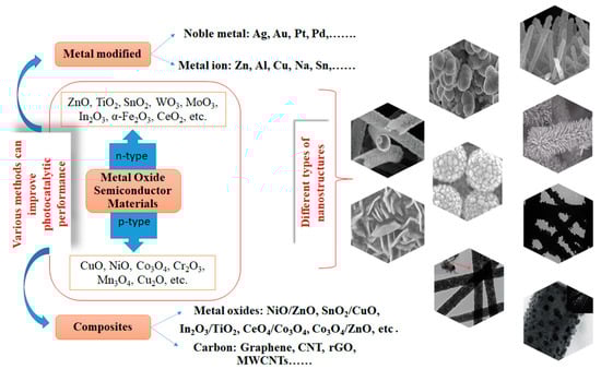 Different semiconducting metal oxide nanostructures used for photocatalytic applications.