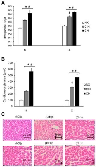 Measurements of RVH: (A) Fulton’s index (right ventricle (RV) weight/(left ventricle (LV) weight + septum weight)); (B) Area of cardiomyocytes (µm2); (C) Representative hematoxylin and eosin staining images of RV slices. Saline solution (s) and zinc (z) groups on day 30. Normoxic group (NX), chronic intermittent hypoxia group (CIH), and chronic hypoxia group (CH). The values are the mean () ± standard error (SE). * p < 0.05 hypoxia vs. NX, # p < 0.05 CIH vs. CH, † p < 0.05 saline (s) vs. zinc (z).