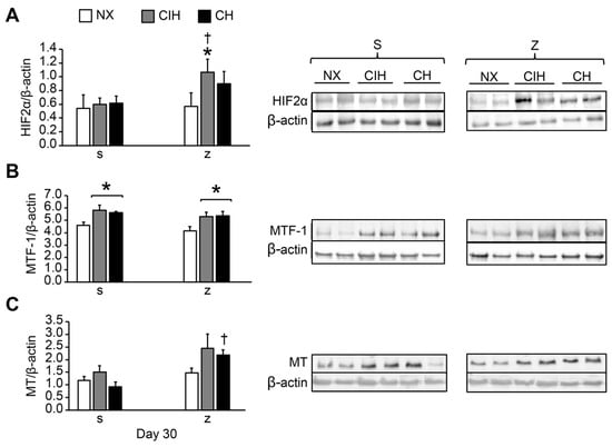Protein expression levels in lung tissue: (A) HIF2α; (B) MTF-1; (C) MT. Saline solution (s) and zinc (z) groups on day 30. Normoxic group (NX), chronic intermittent hypoxia group (CIH), and chronic hypoxia group (CH). Representative bands are shown. The values are the mean () ± standard error (SE). * p < 0.05 hypoxia vs. NX, † p < 0.05 saline (s) vs. zinc (z).