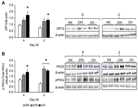Protein expression levels in lung tissue: (A) ZIP12 protein; (B) PKCε activation (p-PKCε/total p-PKCε ratio). Saline solution (s)- and zinc (z)-treated groups on day 30. Normoxic group (NX), chronic intermittent hypoxia group (CIH), and chronic hypoxia group (CH). Representative bands are shown. The values are the mean () ± standard error (SE). * p < 0.05 hypoxia vs. NX.