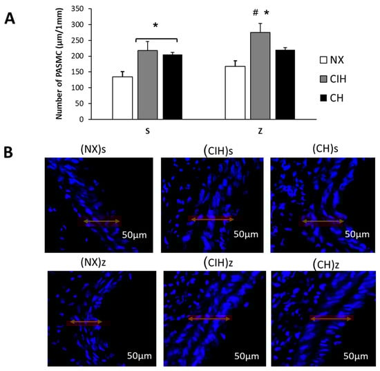 Number of pulmonary artery smooth muscle cells (PASMC). (A) Number of PASMC (µm/1 mm); (B) Representative confocal images, DAPI staining of number PASMC. Saline solution (s)- and zinc (z)-treated groups on day 30. Normoxic group (NX), chronic intermittent hypoxia group (CIH), and chronic hypoxia group (CH). Representative bands are shown. The values are the mean () ± standard error (SE). * p < 0.05 hypoxia vs. NX, # p < 0.05 CIH vs. CH.