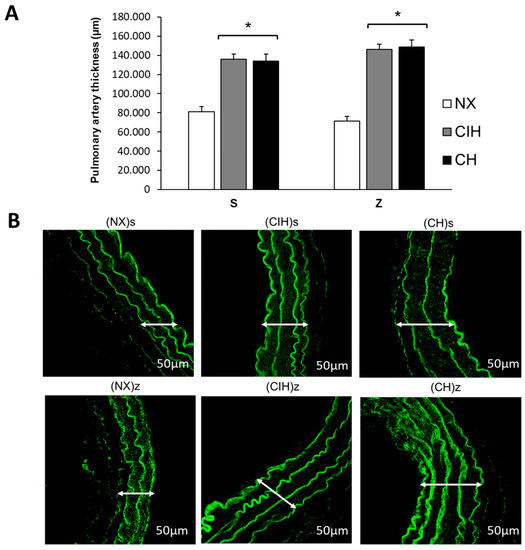 Pulmonary artery thickness. (A) Pulmonary artery wall thickness (µm); (B) Representative confocal images of the pulmonary artery wall thickness. Saline solution (s)- and zinc (z)-treated groups on day 30. Normoxic group (NX), chronic intermittent hypoxia group (CIH), and chronic hypoxia group (CH). Representative bands are shown. The values are the mean () ± standard error (SE). * p < 0.05 hypoxia vs. NX.