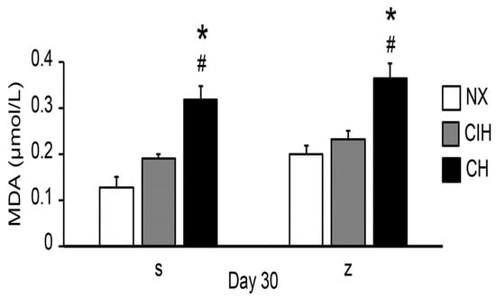MDA levels in the saline solution (s) and zinc (z) groups on day 30. Normoxic group (NX), chronic intermittent hypoxia group (CIH), and chronic hypoxia group (CH). The values are the mean () ± standard error (SE). * p < 0.05 hypoxia vs. NX, # p < 0.05 CIH vs. CH.