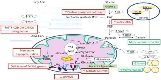 Clinical links between PH and metabolic diseases have been suspected, leading to the classification of PH associated with metabolism syndromes in WHO group 5 [1]. Among the key components of mitochondrial metabolism in pulmonary ECs are Fe–S clusters, the alteration of which might be involved in the pathophysiology of PH [75]. Fe–S clusters are important cofactors of Complexes I, II, and III and are responsible for ETC dysfunction when altered. In humans, genetic mutations in the iron–sulfur cluster assembly protein or the BolA family member 3 or genetic mutations in iron–sulfur cluster scaffold protein (NFU1) genes, which are responsible for Fe–S cluster biogenesis and insertion into the ETC, induce exercise intolerance, myopathy, and death in some cases [75,76]. Interestingly, the development of PAH has also been described in some patients with these mutations [77,78]. These data are reinforced by preclinical models [75,79,80]. In addition, the deficiency of frataxin, a Fe–S biogenesis protein, generated the senescence of the pulmonary endothelium [81]. Furthermore, one of the mechanisms of hypoxia-inducible microRNA-210 (mir-210) in the physiopathology of PAH is thought to be the repression of the assembly of Fe–S clusters [82,83]. Very interesting, the genetic modification of NFU1 induced the decreased activity of Complex II and PDH [76]. The homozygous NFU1G206C rat is the first animal model of PAH driven by a Fe–S biogenesis gene mutation. It has provided insight into the link between the Fe–S system and mitochondrial metabolic abnormalities in PAH. These data emphasize the interest of restoring the Fe–S system in PAH, and further studies are needed to better understand the intrinsic mechanisms related to mitochondrial dysfunction.