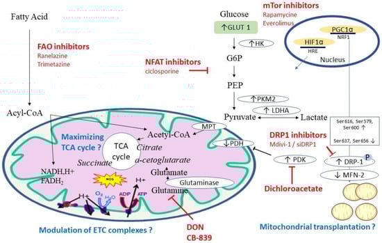 Current therapeutic options targeting mitochondrial dysfunction in PAH. Acyl-CoA: acyl-coenzyme A; DON: 6-Diazo-5-oxo-L-norleucine; DRP-1: dynamin-related protein 1; FAO: fatty acid oxidation; GLUT 1: glucose transporter 1; G6P: glucose-6-phosphate; HIF: hypoxia inducible factor; HK: hexokinase; HRE: hypoxia response element; LDHA: lactate dehydrogenase; Mdivi-1: mitochondrial division inhibitor 1; MFN-2: mitofusin-1; MPT: mitochondrial pyruvate transporter; mTOr: mammalian target of rapamycin; NFAT: Nuclear factor of activated T-cells; PDH: pyruvate dehydrogenase, PDK: pyruvate dehydrogenase kinase; PEP: phosphoenolpyruvate; PGC 1: Peroxisome proliferator-activated receptor-gamma coactivator; PKM2: pyruvate kinase isoform M2; TCA cycle: tricarboxylic acid cycle.