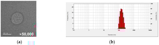 (a) To investigate the particle formation of glycylserylamine and the encapsulation of nafamostat, transmission electron microscopy (Talos L120C, FEI, Prague, Czech) was employed to observe MDB-601a-NM samples at a magnification of 50,000 times. (b) The particle size analysis of the synthesized MDB-601a-NM nanoparticles using a particle size analyzer (SZ-100V2, HORIBA instruments Inc., Kyoto, Japan). The x-axis at the bottom of represents the particle size, and the left y-axis represents the frequency distribution of particle sizes.