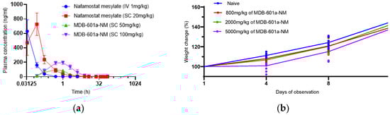 Pharmacokinetics of MDB-601a-NM were evaluated in 6–8-week-old Sprague-Dawley rats through intravenous (IV) and subcutaneous (SC) administration of Nafamostat and MDB-601a-NM, with blood samples collected for drug concentration analysis (Figure 2a). Nafamostat exhibited rapid clearance in rats administered 1 mg/kg IV, with undetectable levels within 0.5 h. In rats administered 20 mg/kg SC, nafamostat was detected after 2 h. In contrast, MDB-601a-NM demonstrated sustained drug concentration in the sera, with increasing concentrations observed up to 0.033 h post-administration and persisting for up to 8 h at a dose of 50 mg/kg. Furthermore, MDB-601a-NM exhibited a longer in vivo half-life compared to nafamostat when administered subcutaneously, with drug concentration persisting for more than 2 h.