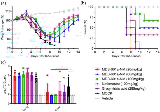 Evaluation of the therapeutic efficacy of MDB-601a-NM, nafamostat, and glycyrrhizic acid in SARS-CoV-2 infected K18-hACE2 transgenic mice. (a) Weight change was monitored daily for 14 DPI. (b) Survival rates. (c) Evaluation of the viral replications in lung and brain tissues of SARS-CoV-2 infected mice. One-way ANOVA with Tukey’s multiple comparison test; * p < 0.05.