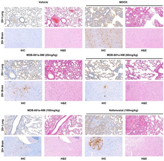 We performed H&E and IHC staining of lung and brain tissues from mice treated with MDB-601a-NM at 5 DPI. The collected tissues were inactivated using a 10% formalin solution for 14 days. After staining, we evaluated preclinical symptoms such as severe lesions, destroyed cells, detected immunocytes, and the presence of SARS-CoV-2 antigen, which resulted from pneumonia (Figure 4). The lung and brain tissues of the vehicle group displayed clear and healthy lesions in both H&E and IHC staining. In contrast, the mock and nafamostat-treated groups exhibited severe lesions, with immunocytes present in alveoli and respiratory veins in H&E staining, and a large number of SARS-CoV-2 antigens detected in IHC staining. However, the MDB-601a-NM treated groups demonstrated histopathological differences that depended on the treatment dose. The 20 mg/kg group exhibited severe lesions similar to the mock-treated group and detected a large number of antigens in the lung and brain tissues. The 60 mg/kg group displayed moderate lesions and antigens, while the 100 mg/kg group showed clear alveoli with fewer immunocytes and antigens detected in lung and brain tissues. These results indicate that the protective efficacy of MDB-601a-NM is dependent on the treatment dose, and higher doses demonstrate improved efficacy.