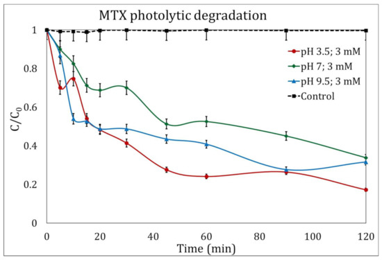In the past, Kanjal et al. [33] found MTX photolysis degradation as low as 9% after 30 min of experimentation; in this research, 17% degradation under acidic conditions was achieved.