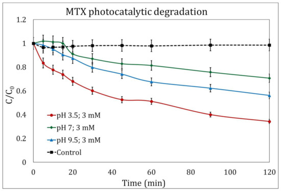 Reguzzoni reported in 2017 [38] that the degradation of MTX with TiO2-P25/UV is not sensitive to pH, even when considering the zero charge point of the photocatalyst, which should favor attraction at low pH. In his research, it was established that the acidic pH hinders the degradation due to the coverage of the MTX on the TiO2 surface, inhibiting the photoactivation of the catalyst. In the present study, acidic pH actually improved photodegradation, so no evidence of such coverage was found.