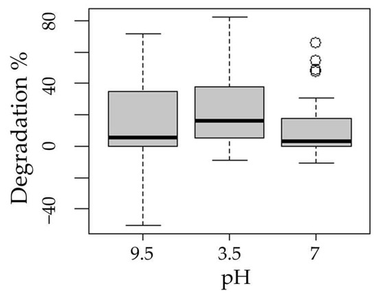 The following boxplots show the means of degradation with respect to the factors process (Figure 3), pH (Figure 4), presence of hydrogen peroxide (Figure 5), and experimentation time (Figure 6).
