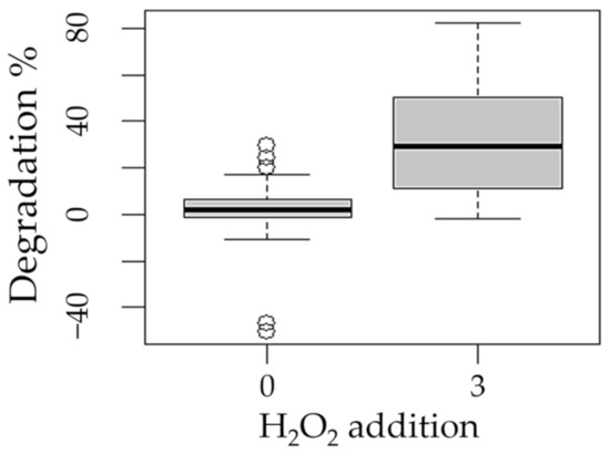 Figure 5. Boxplot of the degradation of methotrexate with respect to the factor addition of hydrogen peroxide (0 and 3 mM/L).