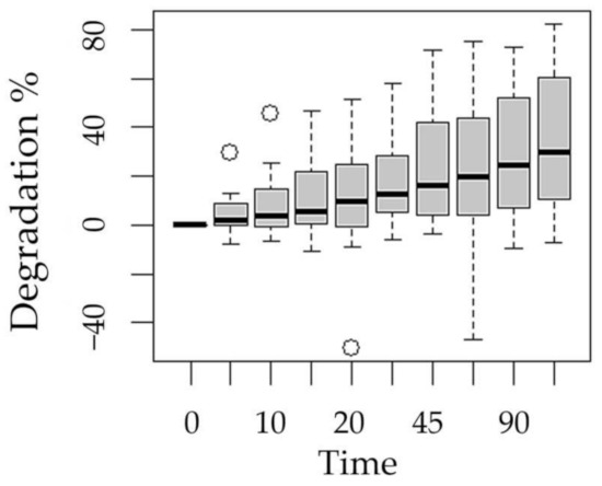 Figure 6. Boxplot of methotrexate degradation with respect to the experimentation time factor.