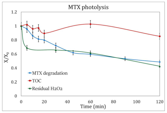 Control experiments were performed in the absence of radiation, showing a maximum degradation of less than 1% after 120 min of reaction; therefore, the presence of H2O2 is not sufficient to degrade MTX if UV light is not involved in the process.