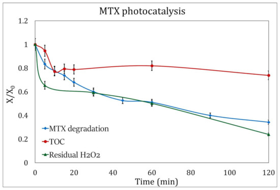 Control experiments carried out with the presence of TiO2 and H2O2 in the absence of UV radiation showed a maximum degradation of 1.5% after 120 min of reaction, demonstrating that the presence of the photocatalyst is not enough to degrade MTX. Moreover, MTX does not absorb on the photocatalysts, as stated by Lai et al. [10].