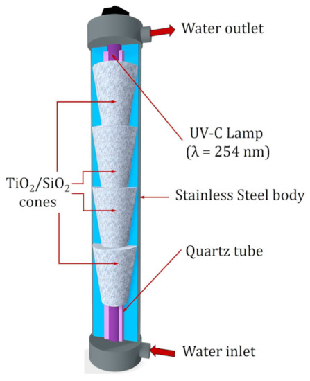 The system where the reactor is located consists of a 200 L tank, a pump with a power of 1 hp that allows recirculating the sample through the entire system, and a 50 μm filter. The main part of the system is a stainless-steel compartment that has a low-pressure mercury lamp (radiation peak of 254 nm, T5 Philips, Amsterdam, The Netherlands) as a source of UV radiation. A quartz tube surrounds the UV lamp to prevent it from coming into direct contact with the sample. Both components are in the center of the reactor, and in this way, the radiation is reflected by the polished inner surface of the stainless-steel body of the reactor to the photocatalyst and the sample. For photocatalysis experiments, the reactor has four stainless steel cones that contain a SiO2 mesh where the TiO2 is impregnated. For photolysis processes, as in this study, the cones are removed to avoid the presence of the photocatalyst (Figure 9) [42].