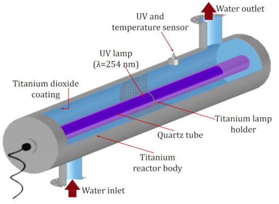 The reactor used for photocatalysis was the commercial model AOP1 (Bright-Water Environmental, Harleston, Norfolk, UK). Figure 10 shows the reactor, made up of a titanium cylinder with dimensions of 75 mm in diameter and 475 mm in length, covered on the inside by a layer of TiO2. A 254 nm radiation-emitting lamp was used as a radiation source.