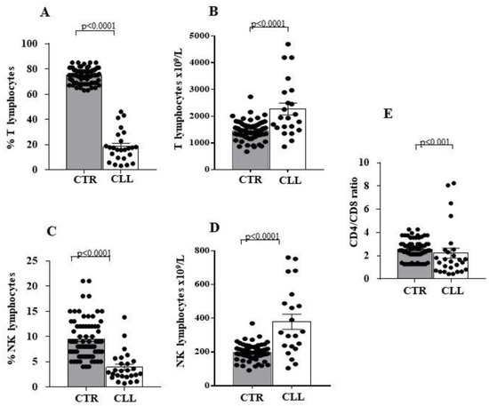 According to the literature [19,20,21,22,23,24,25,26,27], we observed that the reduction in T (18.54 ± 2.45 vs. 74.64 ± 0.67 in controls; p < 0.0001) and NK (3.90 ± 0.58 vs. 9.48 ± 0.45 in controls; p < 0.0001) lymphocyte percentages (Figure 1A,C, respectively) is accompanied by an increase in the absolute number of T (2268 ± 225.4 vs. 1456 ± 38.58 in controls; p < 0.0001) and NK cells (379.7 ± 44.94 vs. 197.5 ± 5.23 in controls; p < 0.0001) in CLL subjects (Figure 1B,D, respectively). Furthermore, we observed a significant decrease in the CD4/CD8 T-cell ratio in CLL patients when compared to healthy subjects (2.21 ± 0.42 vs. 2.53 ± 0.09 in controls; p < 0.001) (Figure 1E).